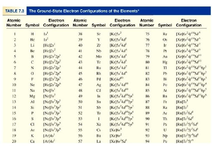 Aufbau Principle • The “building up” order corresponds for the most part to increasing energy of the subshells. By filling orbitals of the lowest energy first, you usually get the lowest total energy (“ground state”) of the atom. Now you can see how to reproduce the electron configurations of Table 7. 3 using the Aufbau principle. Remember, the number of electrons in the neutral atom equals the atomic number, Z.