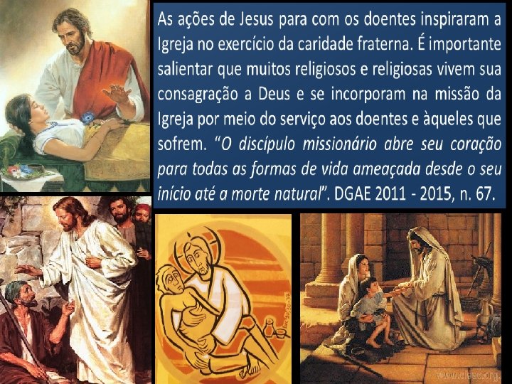 CARTAZ A. Atualiza o encontro do Bom Samaritano com o doente que necessita de cuidado B. A mão do profissional da saúde segurando as mãos do doente afasta cultura da morte e viabiliza a acolhida entre irmãos (o próximo). C. A Igreja como mãe, na sua samaritanida -de, aproxima e cuida dos doentes, de todos que se encontram à margem do caminho.