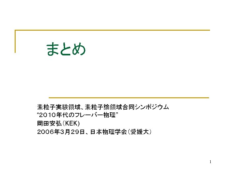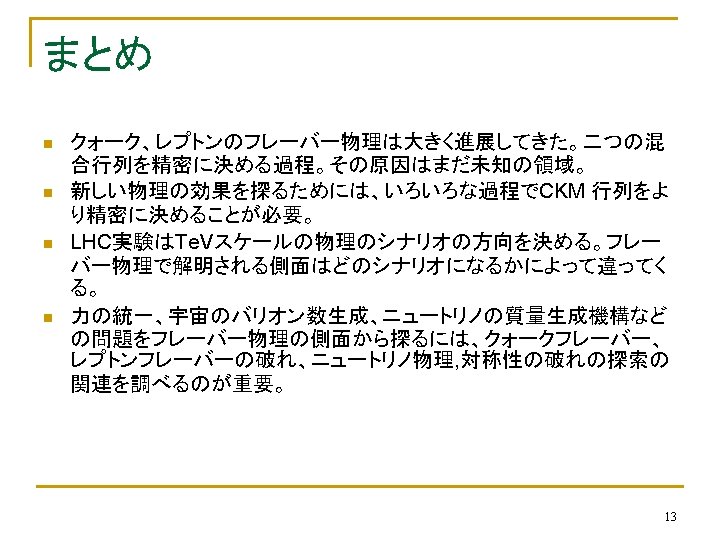 LFVとニュートリノ質量生成 n 単純なDirac または Seesaw ニュートリノでなければ、m やt のLFV 過程に様々な効果が期待できる。 Non-SUSY Dirac/Seesaw No sizable effects on LFV SUSY GUT/Seesaw B( m->e g ) ~ 102 (B(m->3 e) ~B(m. A-e. A)) B( t->m g ) ~ 102 B(t->3 m) Triplet Higgs for B(m->3 e) ~ B(m->eg) ~B(m. A-e. A) neutrino or B(m->3 e) ~ 102 (B(m->eg) ~B(m. A-e. A)) Left-Right model B(m->3 e) ~ 102 (B(m->eg) ~B(m. A-e. A)) B(t->3 m) ~ 102 B(t->mg) Dirac n in warped extra-dim B( m->e g ) ~ 102 (B(m->3 e) ~B(m. A-e. A)) 12