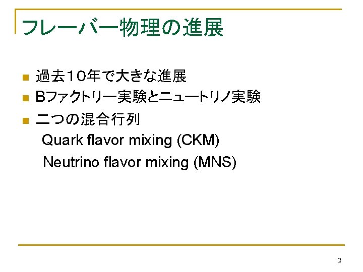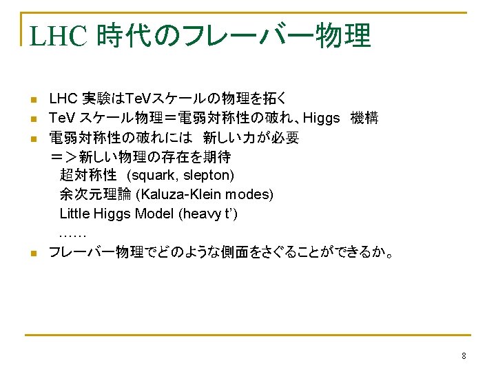 Flavor mixing の原因は? n Quark flavor mixing, neutrino flavor mixing は W boson との相互作用のフレーバーの遷移がわかった。 もともとの原因はまだ未知。 Origin of quark masses and mixings => Higgs 物理(Higgs branching ratio) Origin of neutrino masses Dirac mass かMajorana mass? もしseesaw 機構としたらそのスケールは? double b decay collier signals for lepton number violation 7