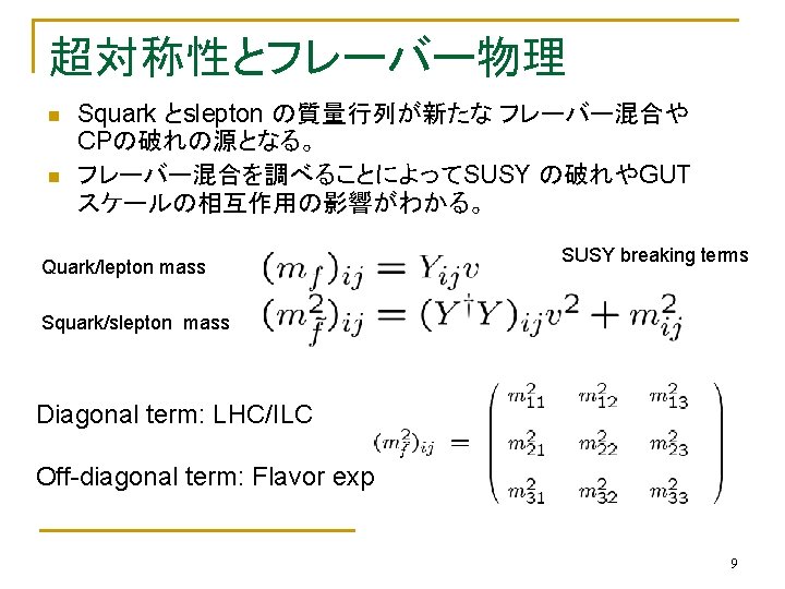 “SUSY mass unification” at LHC/ILC Flavor Physics/ Symmetry Violation Quark FCNC (B->f. Ks, b->sg, Dms, . . ) LFV (m->eg, t->mg, …) EDM (n. EDM, e. EDM, m. EDM) Nucleon decay => GUT, Seesaw mechanism, Leptogenesis 10
