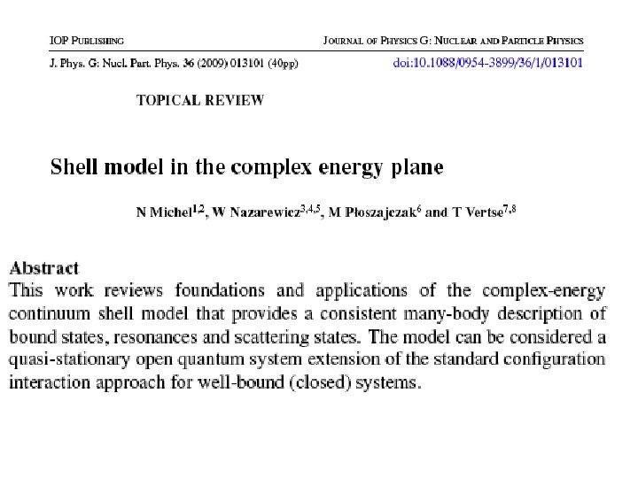 Continuum Shell Model -an old tool! • U. Fano, Phys. Rev. 124, 1866 (1961) • C. Mahaux and H. Weidenmüller: “Shell Model Approach to Nuclear Reactions” 1969 • H. W. Bartz et al. , Nucl. Phys. A 275, 111 (1977) • D. Halderson and R. J. Philpott, Nucl. Phys. A 345, 141 • … • J. Okolowicz, M. Ploszajczak, I. Rotter, Phys. Rep. 374, 271 (2003) Recent Developments: SMEC • K. Bennaceur et al. , Nucl. Phys. A 651, 289 (1999) • K. Bennaceur et al. , Nucl. Phys. A 671, 203 (2000) • N. Michel et al. , Nucl. Phys. A 703, 202 (2002) • Y. Luo et al. , nucl-th/0201073 Gamow Shell Model • N. Michel et al. , Phys. Rev. Lett. 89, 042502 (2002) • N. Michel et al. , Phys. Rev. C 67, 054311 (2003) • N. Michel et al. , Phys. Rev. C 70, 064311 (2004) • R. Id Betan et al. , Phys. Rev. Lett. 89, 042501 (2002) • R. Id Betan et al. , Phys. Rev. C 67, 014322 (2003) • G. Hagen et al, Phys. Rev. C 71, 044314 (2005) Other approaches