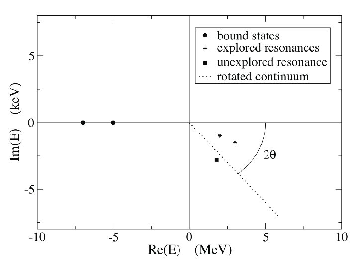 Complex Scaling Introduced in the early 1970 s in atomic physics to guarantee that wave functions and resonances are square integrable. Uniform complex scaling The transformed Hamiltonian is no longer hermitian as it acquires a complex potential. However, for a wide class of local and nonlocal potentials, called dilation-analytic potentials, the so-called ABC is valid: • The bound states of h and hq are the same; • The positive-energy spectrum of the original Hamiltonian h is rotated down by an angle of 2 q into the complex-energy plane; • The resonant states of h with eigenvalues En satisfying the condition |arg(En)|<2 q are also eigenvalues hq and their wave functions are square integrable.