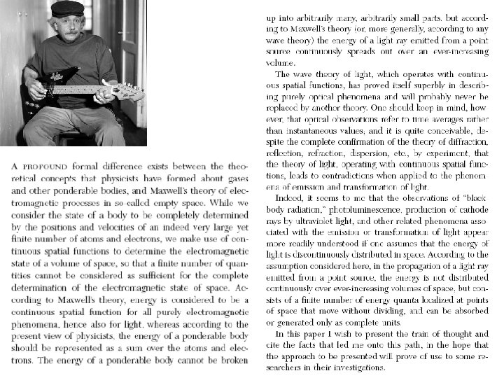 Los tres celebres artículos de 1905: El movimiento browniano El efecto fotoeléctrico La relatividad especial Interacción entre la luz y la materia (un haz de luz sobre una placa metálica) Dos dificultades: 1) La corriente depende de la frecuencia 2) Esta función tiene un umbral, por debajo de una cierta cantidad (cuanto), aun a gran amplitud, no genera corriente.