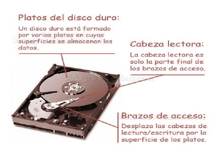 Características • Un disco duro se compone de muchos elementos; citaremos los más importantes de cara a entender su funcionamiento. • En primer lugar, la información se almacena en unos finos platos o discos, generalmente de aluminio, recubiertos por un material sensible a alteraciones magnéticas. .
