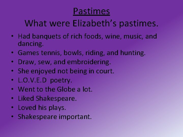 Pastimes What were Elizabeth’s pastimes. • Had banquets of rich foods, wine, music, and dancing. • Games tennis, bowls, riding, and hunting. • Draw, sew, and embroidering. • She enjoyed not being in court. • L. O. V. E. D poetry. • Went to the Globe a lot. • Liked Shakespeare. • Loved his plays. • Shakespeare important.