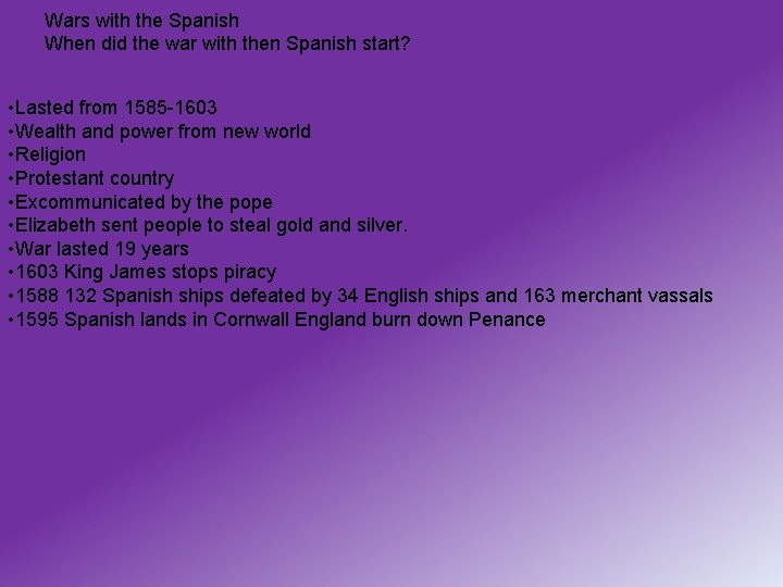 Wars with the Spanish When did the war with then Spanish start? • Lasted from 1585 -1603 • Wealth and power from new world • Religion • Protestant country • Excommunicated by the pope • Elizabeth sent people to steal gold and silver. • War lasted 19 years • 1603 King James stops piracy • 1588 132 Spanish ships defeated by 34 English ships and 163 merchant vassals • 1595 Spanish lands in Cornwall England burn down Penance