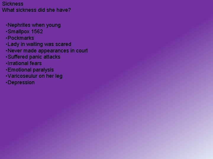 Sickness What sickness did she have? • Nephrites when young • Smallpox 1562 • Pockmarks • Lady in waiting was scared • Never made appearances in court • Suffered panic attacks • Irrational fears • Emotional paralysis • Varicoseulur on her leg • Depression