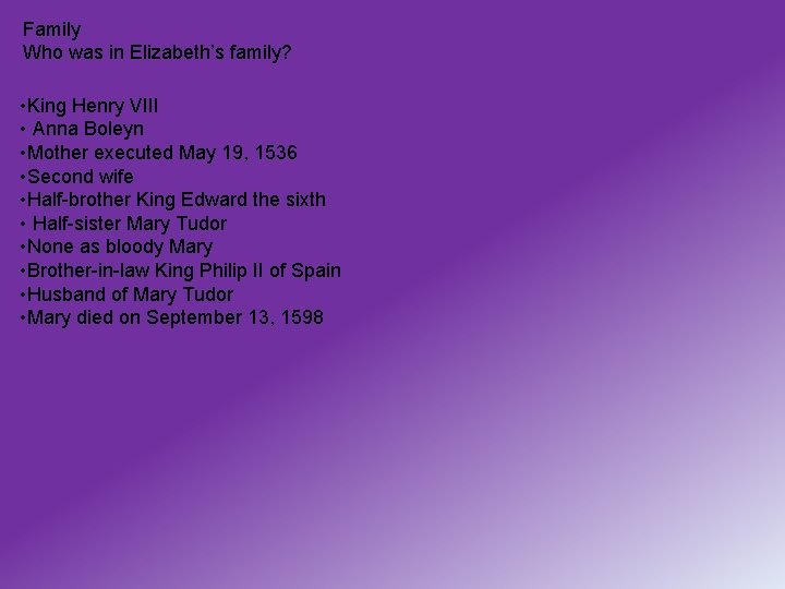 Family Who was in Elizabeth’s family? • King Henry VIII • Anna Boleyn • Mother executed May 19, 1536 • Second wife • Half-brother King Edward the sixth • Half-sister Mary Tudor • None as bloody Mary • Brother-in-law King Philip II of Spain • Husband of Mary Tudor • Mary died on September 13, 1598