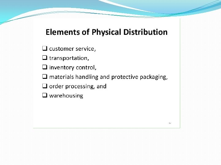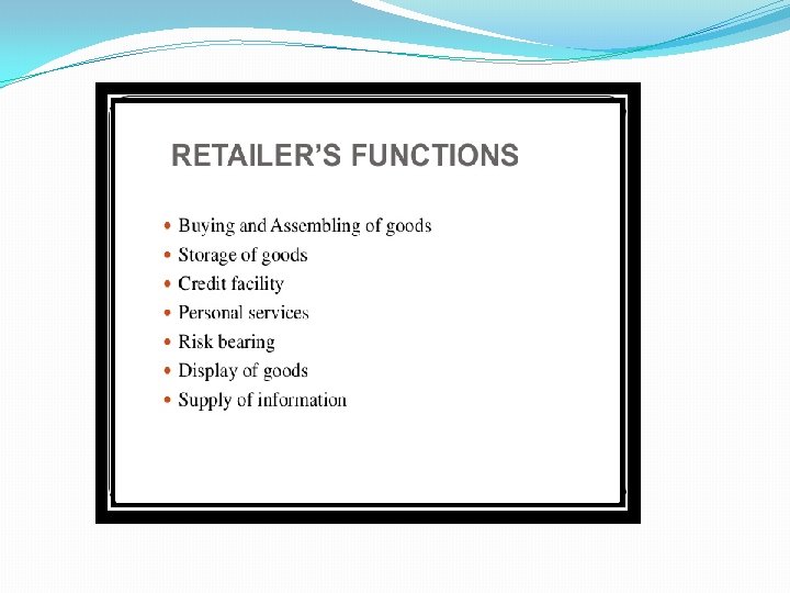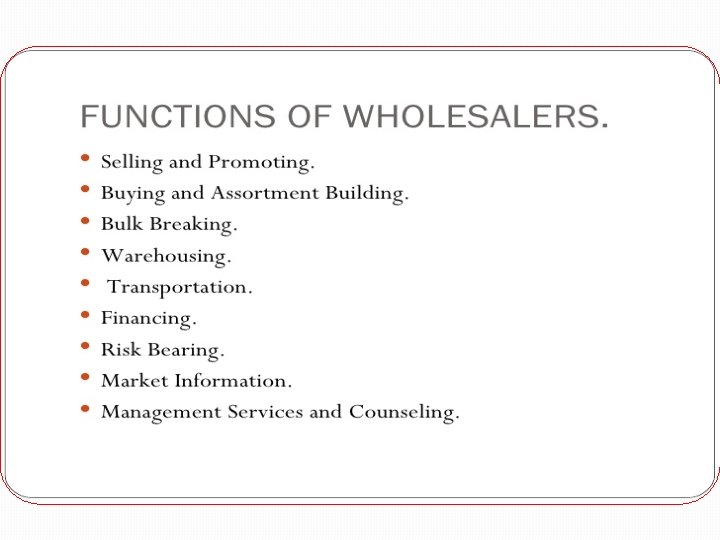 v The intermediaries reduce the transaction costs because of the lower number of links between manufacturers and buyers. v They are the source of information for manufacturers. The intermediaries provide information about the market like demand, competitors, consumer behaviour, consumer buyer behaviour, etc. (marketing environment) which helps manufacturers in altering marketing strategies or identifying new needs and wants in the market (information on opportunities and threats). v Intermediaries take the risk of new product launches. Irrespective of the acceptance of a new product in the market, the intermediaries take the risk of managing the new product that requires investment in time, effort and money. v. The intermediaries perform the function of product storage as well as transportation. In their absence, the manufacturer will have to perform these functions. They take the risk of transportation and storage. v. The intermediaries help promote products via different in-store promotion activities like distribution of pamphlets, display, assigning shelf space, store salesman, etc. For example, customers do ask the store representatives about the value of the product, any complaints from other customers, etc. v. Knowledge of the region – a manufacturer will need help of local people in the target market on the expertise on the local language, culture, etc. The retailers, etc. perform this function, and help the manufacturer in implementing its marketing strategies. Conti…