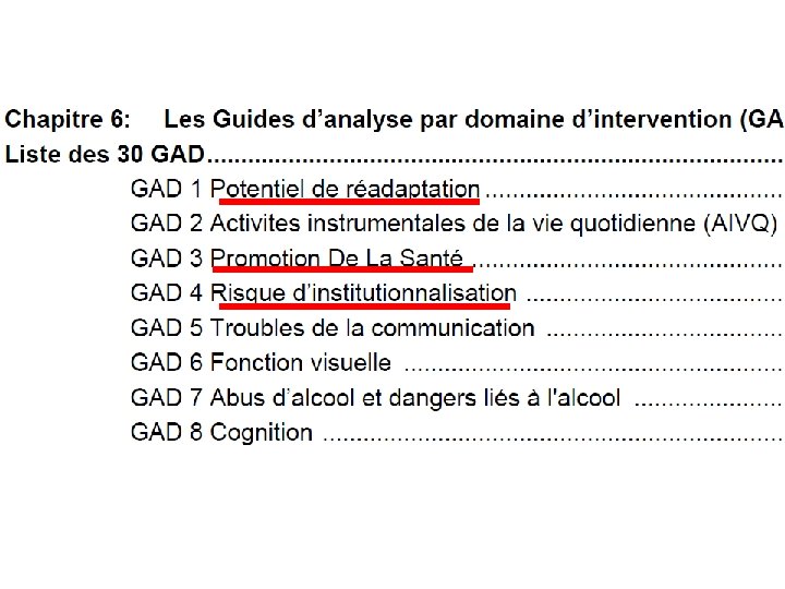 Le RAI-Domicile Manuel Les GAD AVQ: potentiel d’amélioration • Objectif: Que Mr. X améliore ses performances dans les AVQ • Recommandations GAD AVQ: – Se centrer sur les activités qui ont un sens pour le client et sa famille – Evaluer les causes de déficience. – Ségmenter les tâches pour les AVQ. – Mettre en évidence les progrés réalisés…