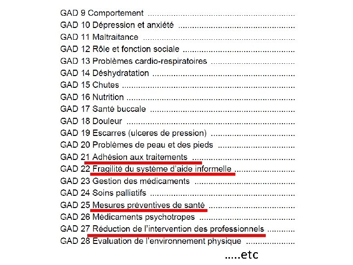 Les GAD • Recommandations: – Identification de l’état confusionnel (critères) – Recherche d’une démence (critères) – Répercussions des déficits cognitifs et maximiser les fonctions – Soutien aux proches