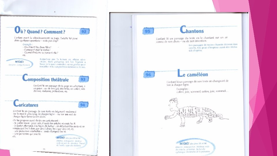 L’oralisation expressive Dans un texte comportant un dialogue, mettre les enfants en groupe de 2 ou 3 pour se répartir la parole et préparer une lecture à plusieurs voix. Dans un texte à une seule voix, travailler les effets ( suspense, effet comique, emphase…) Ce travail s’inscrit en fin de parcours de lecture du texte. 104 jeux de lecture de Yak Rivais