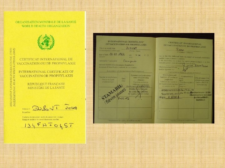 Fièvre jaune • Arbovirose due au virus amaril transmis à l ’homme par un moustique hématophage du genre Aedes • Maladie dont la vaccination donne lieu à l ’établissement d ’un carnet international de vaccination par un centre agréé • centre agréé : vaccin thermostable? + carnet