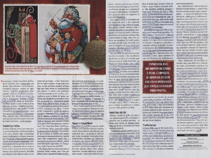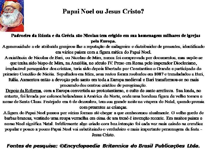 “São Nicolau, bispo de Mira santo venerado pelos gregos e l no dia 6 de dezembro. . . A len sua dádiva oferecida as escond de dotes, às três filhas de um cid empobrecido. . . Diz se ter origin costume de dar presentes as es das no dia de São Nicolau dezembro), o que mais tard transferido para o dia de Natal. associação do Natal com São N (Papai Noel), que sorrateirame idéia é fazê-lo substituir Pap Céu. ” A Enciclopédia Britânica, Vol. 19 648 -649, 11º edição inglesa.
