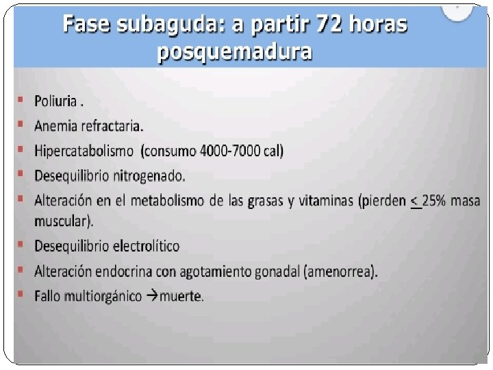 REANIMACION HIDRICA � Primeras 24 horas: Contadas desde la hora en que ocurrió la lesión. � La resucitación debe ser con el 50% del volumen total en las primeras 8 horas y el 50% restante en las siguientes 16 horas. � Fórmula de Parkland para resucitación quemaduras en niños � 4 ml x ASQ (%) x peso (kg) + �Requerimientos basales: � 100 ml por kilo peso primeros 10 kilos � 50 ml por kilo peso segundos 10 kilos � 20 ml por kilo peso > 20 kilos