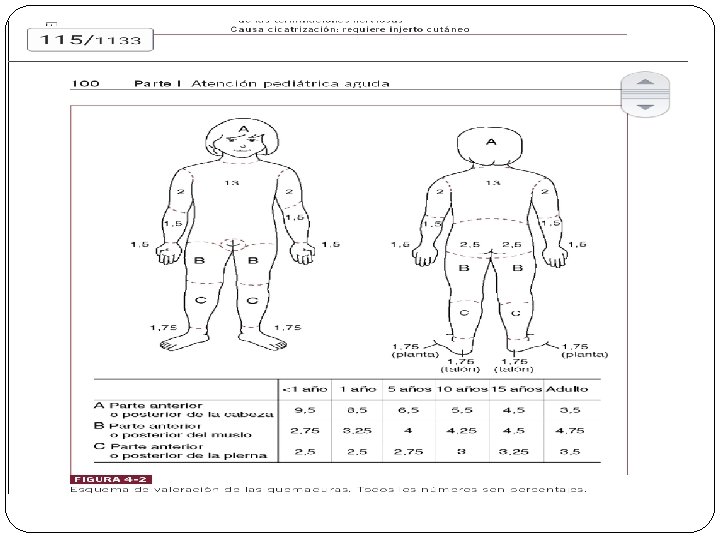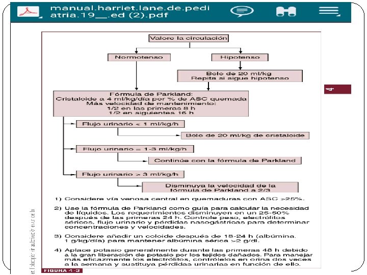 MANEJO � Se hospitaliza a todos los pacientes pediátricos con quemaduras que abarquen más del 10% a 15% de ASC. � Que presenten lesiones en cara, manos, pies, periné o superficies articulares. � Pacientes con quemaduras eléctricas. � Lactantes con más del 10% ASQ. � Preescolares con más del 15% ASQ.