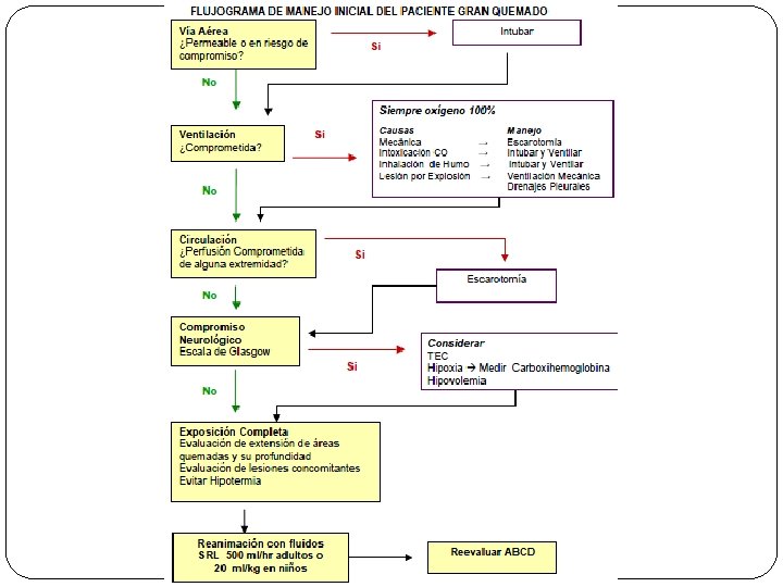 MANEJO INICIAL � EN EMERGENCIA �EVALUACION PRIMARIA �Se realiza la evaluación según el ABLS (Advanced Burn Life Support course) �Se valora el A, B, C, D, E, F de la reanimación. �C � A � B � D �E �F Circulación Vía aérea control de columna cervical. Ventilación. Déficit neurológico. Exposición con cuidado a temperatura ambiental. Resucitación de fluidos.