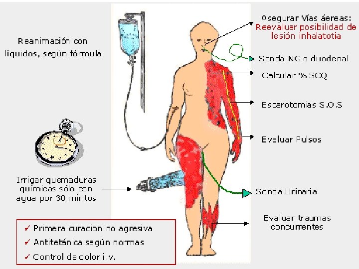 MANEJO �Se realiza un mapeo exacto de las aéreas lesionadas. �Se calcula en forma precisa el volumen de liquido que se va a administrar. �Débito urinario debe mantenerse al menos en 1 ml/kg/h. �Se colocan catéteres sonda nasogástrica, sonda Foley, si lo amerita.