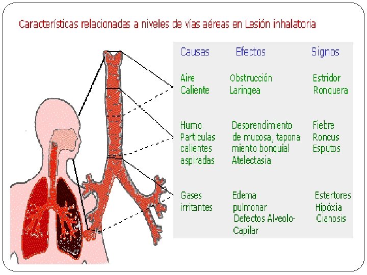TRATAMIENTO �VIA AEREA �SOSPECHA DE LESIÓN POR INHALACION �Quemadura nasal con destrucción de vibrisas �Presencia de quemaduras en la boca �Esputo carbonáceo �Disfonía, tos, sonidos respiratorios guturales �Orales, roncos, sibilancias �Eritema o edema de naso- orofaringe �Intoxicación con CO 2