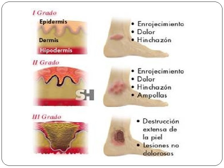 CLASIFICACIÓN SEGÚN PROFUNDIDAD Subdivisión Aspecto clínico Evolución Causa Epidérmicas (A) Eritema No Flictenas Hiperestesia 5 – 10 días Flash Sol Dérmicas Superficiales (AB-A) Base de las flictenas rosada y húmeda Vesículas rosados Sensibilidad 10 -14 días Líquidos Calientes Vapor Dérmicas Profundas (AB-B) Base de las flictenas gris y seca color cereza Hipoalgesia 15 – 30 días 2 – 4 semanas Líquidos Hirvientes Llama cáusticos Hipodérmicas (B) Quemaduras seca, como cuero, acartonada de color negro, mármol blanco, nácar Analgesia Injerto o Secuela Llama Electricidad cáusticos
