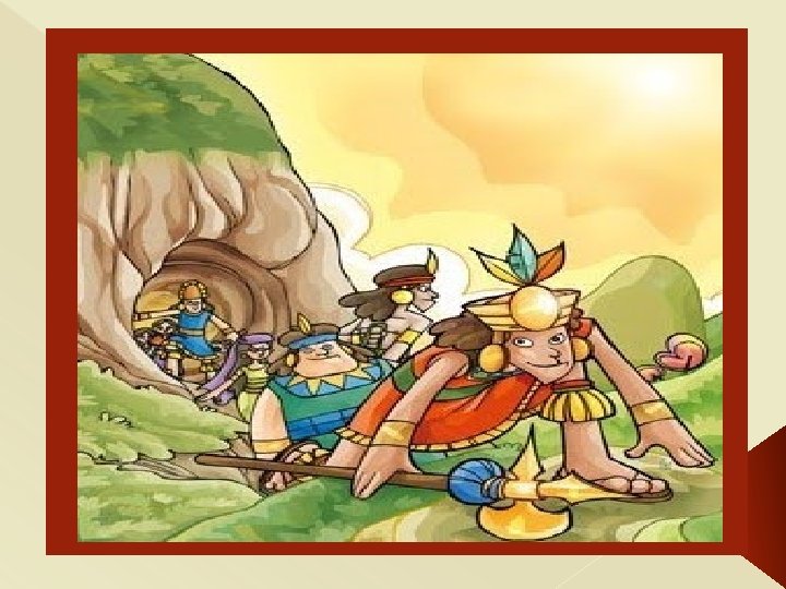 IMPORTANTE: El contenido de las diapositivas se deberá transcribir en el cuaderno de Personal Social, al llegar a las imágenes deberá usted dibujar o pegar. Luego deberá copiar y responder las siguientes interrogantes: 1. - ¿Quiénes salieron del lago Titicaca? 2. - ¿Quién los envió? 3. ¿Qué traía en su mano Manco Cápac? 4. - ¿Dónde se hundió la varilla de oro? 5. - ¿Cómo llamaron al lugar donde se hundió la varilla? 6. - ¿Qué enseñó Manco Cápac a los hombres? 7. - ¿Qué enseñaba Mama Ocllo a las mujeres? 8. - ¿Cómo se llamaron los cuatro hermanos? 9. - ¿De dónde salieron los hermanos Ayar? 10. ¿ Qué le pasó al hermano Ayar Cachi? 11. - ¿Qué sucedió con los hermanos Ayar Uchu y Ayar Auca? 12. - Finalmente ¿Qué pasó con Ayar Manco y las mujeres?