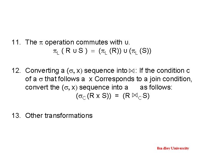 11. The p operation commutes with υ. p. L ( R υ S ) = (p. L (R)) υ (p. L (S)) 12. Converting a (s, x) sequence into : If the condition c of a s that follows a x Corresponds to a join condition, convert the (s, x) sequence into a as follows: (s. C (R x S)) = (R C S) 13. Other transformations