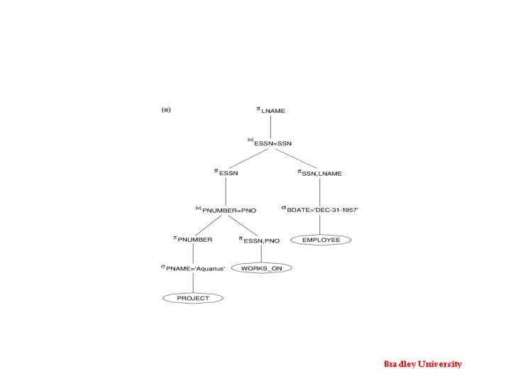 (CONT…) Query Tree Optimization PROJ(LNAME) SELECT(P. PNAME=‘Aquarius’ AND PNUMBER=PNO AND ESSN=SSN X ANDBDATE>’ 1957 -12 -31’) X X WORK_ON EMPLOYEE FIG 1 : INITIAL QUERY TREE PROJECT