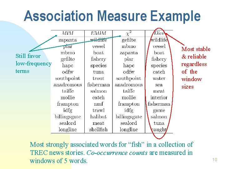 Association Measure Example Similar Topranked words in MIM & X 2 Most strongly associated words for “fish”, a high frequent term, in a collection of TREC news stories. 9