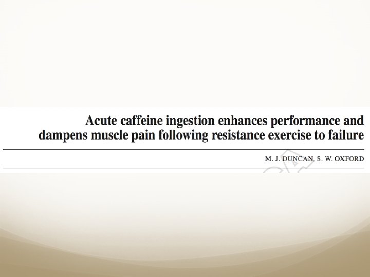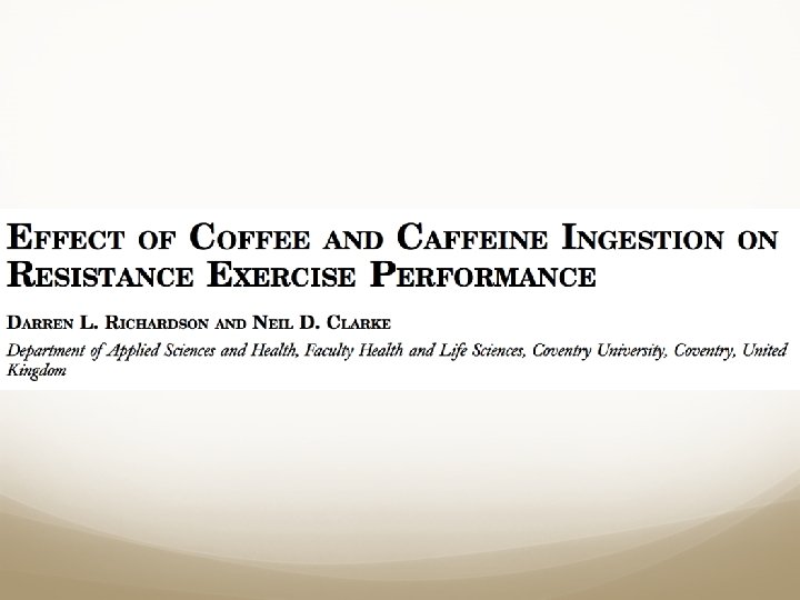 Références Richardson DL and Clarke ND. Effect of coffee and caffeine ingestion on resistance exercise performance, Journal of Strength and Conditioning Research 30(10): 2892 -2900, 2016. Da Silva VL, Messias FR, Zanchi NE, Gerlinger-Romero F, Duncan MJ and Guimarães-Ferreira L, Effects of acute caffeine ingestion on resistance training performance and perceptual responses during repeated sets to failure, Journal Sports Medicine and Physical Fitness 55(5): 383 -389, 2015. Duncan MJ, Stanley M, Parkhouse N, Cook K and Smith M, Acute caffeine ingestion enhances strength performance and reduces perceived exertion and muscle pain perception during resistance exercise, European Journal Sport Science 13(4): 392 -999, 2011. Duncan MJ & Oxford SW, Acute caffeine ingestion enhances performance and dampens muscle pain following resistance exercise to failure, Journal Sports Medicine and Physical Fitness 52(3): 280 -285, 2012. Bordeaux B, Lieberman HR, LIpman TO and Sullivan DJ, Benefits and risks of caffeine and caffeinated beverages, Uptodate, https: //www. uptodate. com/contents/benefits-and-risks-of-caffeine-and-caffeinatedbeverages? source=search_result&search=caffeine&selected. Title=5~150#H 4 Giardina EG, Gersh BJ and Saperia GM, Cardiovascular effects of caffeine and caffeinated beverages, Uptodate, https: //www. uptodate. com/contents/cardiovascular-effects-of-caffeine-and-caffeinatedbeverages? source=search_result&search=caffeine&selected. Title=6~150#H 1