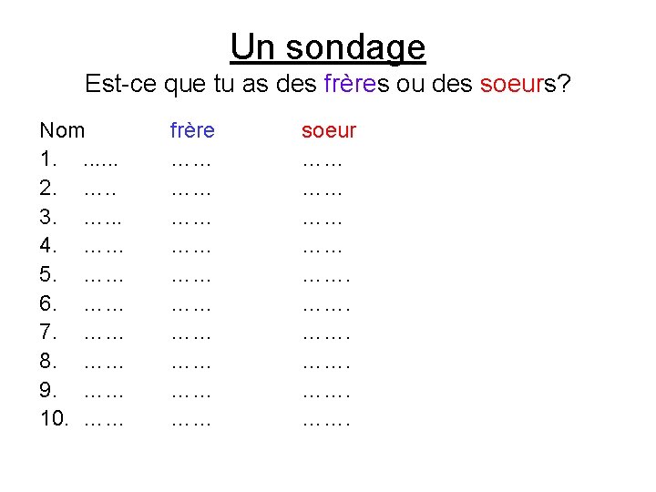 frères que tu soeurs des as Est-ce des ou? = ……………………. . ? Est-ce que tu as des frères ou des soeurs?