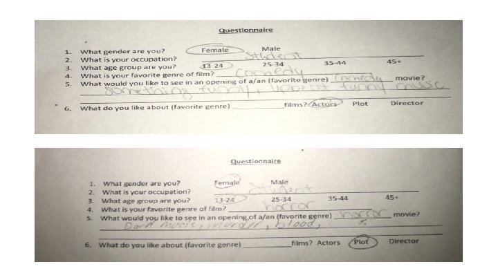 Questionnaire • In doing my research I discovered that most teenagers prefer comedy and horror with openings that give a jarring response to hopefully evoke an emotion. Whether it be fear or laughing, intense reactions is what they’re looking for in a film