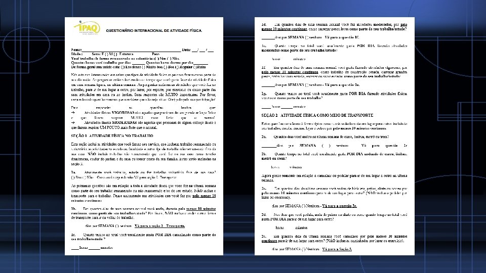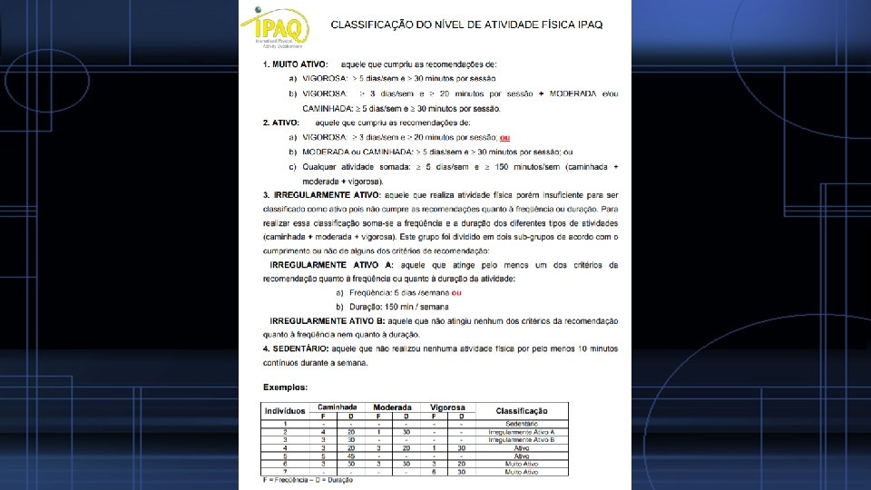 ▪ Questionário Internacional de Atividade Física (International Physical Activity Questionnaire – IPAQ); ▪ Validado em 12 países (Austrália, Canadá, Finlândia, Guatemala, Itália, Japão, Portugal, África do Sul, Suécia, Inglaterra e Estados Unidos); ▪ 14 centros de pesquisa incluindo o centro de estudos do laboratório de aptidão física de São Caetano do Sul ( CELAFICS).