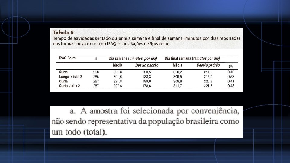 Metodologia ▪ 257 homens e mulheres ▪ Amostra com diferentes graus de escolaridade, profissões e níveis socioeconômicos ▪ Versões longa e curta ▪ Questionário respondido no início do estudo e após 7 dias ▪ 28 indivíduos utilizaram um sensor de movimento(CSA)