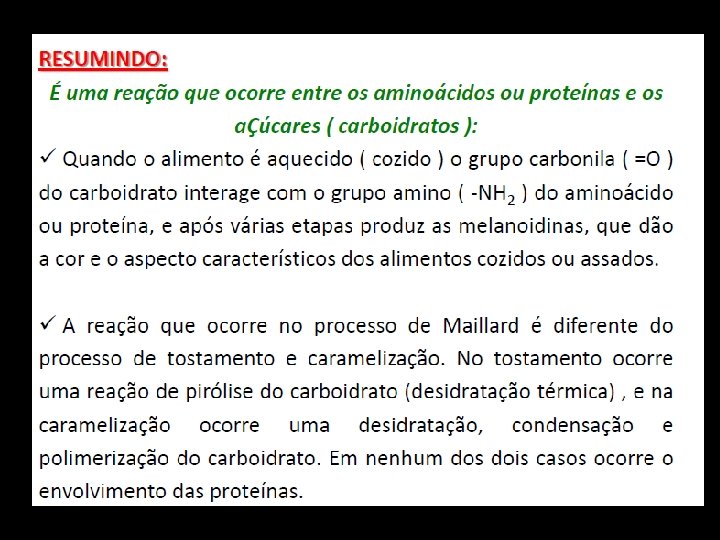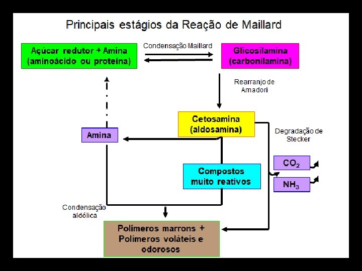 Maillard indesejável • Indesejável para: leite (cor – escurecimento quando por tempo prolongado. Ex. doce de leite), ovos e derivados desidratados • Ocorre entre um grupamento carbonila de açúcares redutores e o grupamento amina de aminoácidos, em meio preferencialmente alcalino, na presença de água e calor