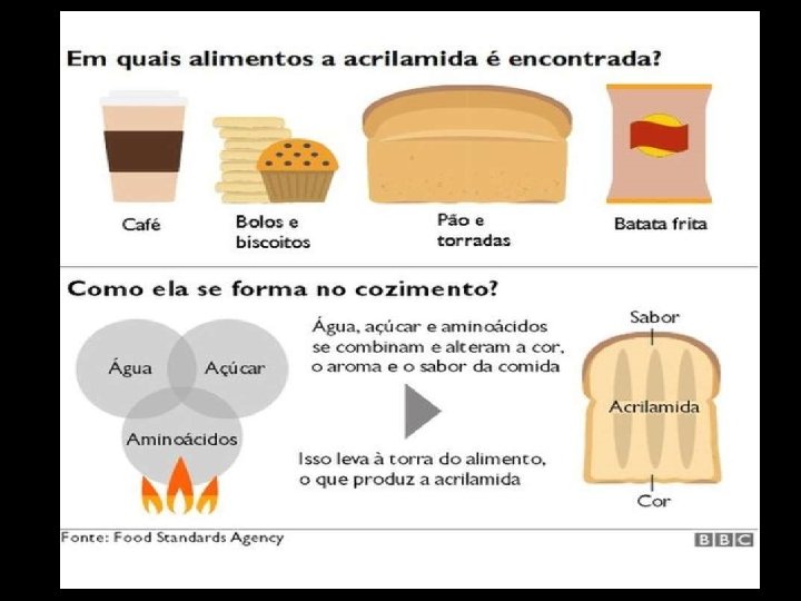 Toxicidade Acrilamida • Encontrada em alimentos fritos e cozidos, como batata frita caseira e de pacote, tortas, produtos de pastelaria, café. • Não é detectada em alimentos que não foram aquecidos ou naqueles preparados com temperatura de cozimento que não atinge valores superiores a 100 C.