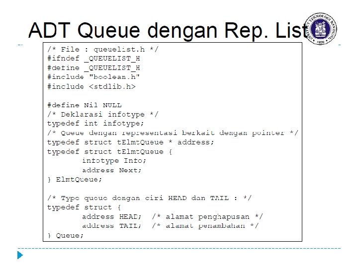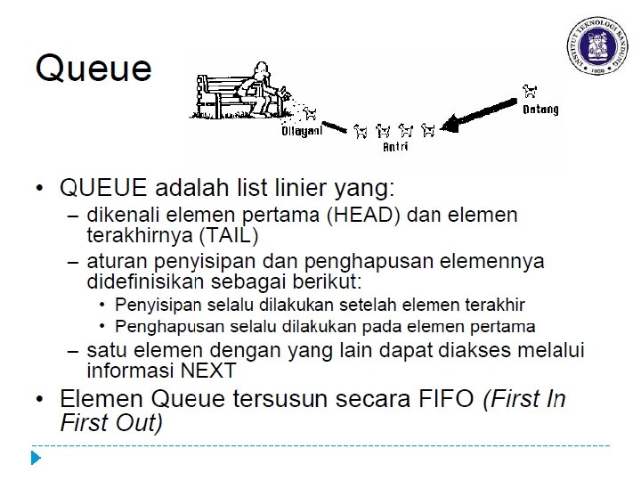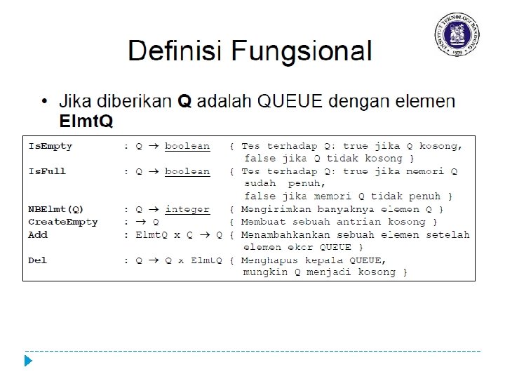 Pustaka Lojik Queue � Is. Empty � Cek apakah antrian kosong � NBElmt � Menghitung banyaknya element queue � Create. Empty � Membuat antrian (queue) kosong � Add � Menambah elemen antrian pada tail (pada dasarnya adalah operasi insert last) � Dell � Menghapus elemen antrian pada head (pada dasarnya adalah operasi delete first)