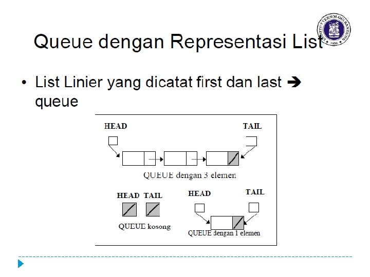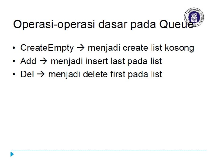 Queue dengan Representasi List � Is. Empty : fungsi yang digunakan untuk mengecek apakah queue sudah kosong � Add / Enqueue: Untuk menambahkan elemen ke dalam Antrian, penambahan elemen selalu ditambahkan di elemen paling belakang (tail) � Del / Dequeue: Digunakan untuk menghapus elemen terdepan/pertama (head) dari Antrian � Is. Full : fungsi yang digunakan untuk mengecek apakah queue sudah penuh