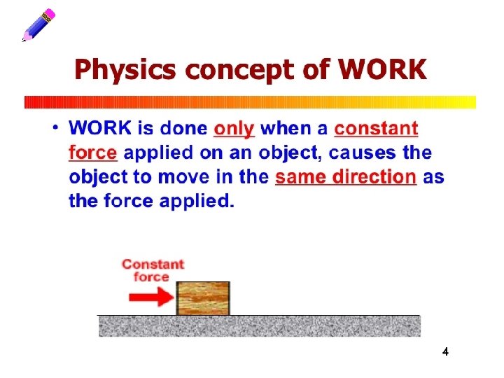 Remembering Physical Science: • Work happens when a force causes an object to move a distance. • It occurs when energy is transferred to an object causing it to move. • Described mathematically by: