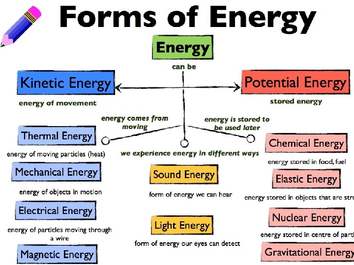 Quick Question: Answer with details, examples, and definitions. Say as much as you can about each one. 1. What is work? 2. What is energy and what are the two major types of energy? 3. What are some of the different forms of energy?