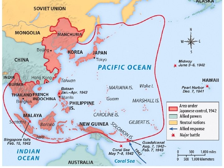 Fighting the War in the Pacific: 1942 • In the months following Pearl Harbor, Japan captured the U. S. outposts of Guam and Wake Island the British colonies of Hong Kong and Singapore. In the Philippine Islands, Supreme Allied Commander in the Pacific, Douglas Mac. Arthur was order to flee from a Japanese invasion. • American spirits were lifted in April 1942. Colonel James Doolittle led a successful bombing raid on Tokyo in a move designed to strike fear in very heart of the Japanese. • Six months after Pearl Harbor, the Battle of Midway was a major turning point in the war with Japan.
