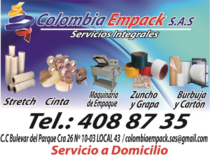 ¡Recuerde! “el empaque es la protección de su producto. ” TEL: 317 414 23 49 - 310 202 7230 / 408 87 35 CRA 26 Nº 10 -03 BOGOTA colombiaempack. sas@gmail. com ventas@colombiaempack. com www. colombiaempack. com