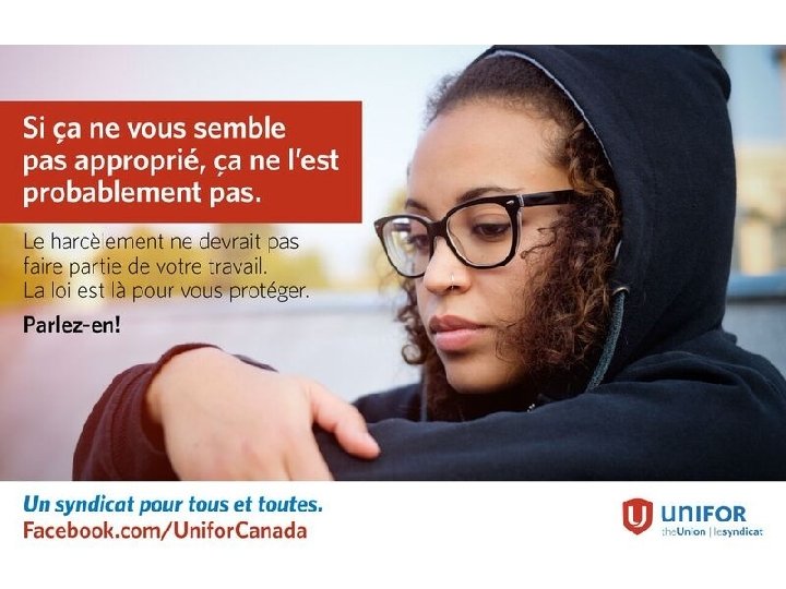 Harcèlement et discrimination La discrimination est une mesure ou une décision qui traite une personne ou un groupe d’une façon négative. La Loi canadienne sur les droits de la personne interdit de traiter quiconque d’une façon négative pour l’un ou l’autre des motifs suivants : • la race • l’origine nationale ou ethnique • la couleur de la peau • la religion • l’âge • le sexe • • • unifor. org l’orientation sexuelle l’état matrimonial la situation familiale une déficience l’état de personne graciée ou la suspension du casier judiciaire