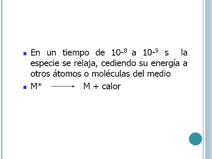TRANSICIÓN S S* Un electrón de una molécula de un orbital s enlazante es excitado al correspondiente orbital antienlazante por absorción de radiación. La molécula se encuentra en un estado excitado. Energía grande – UV vacío