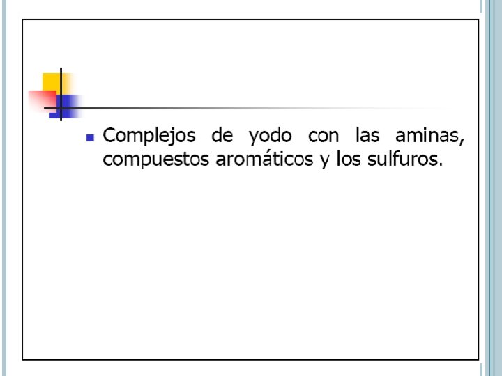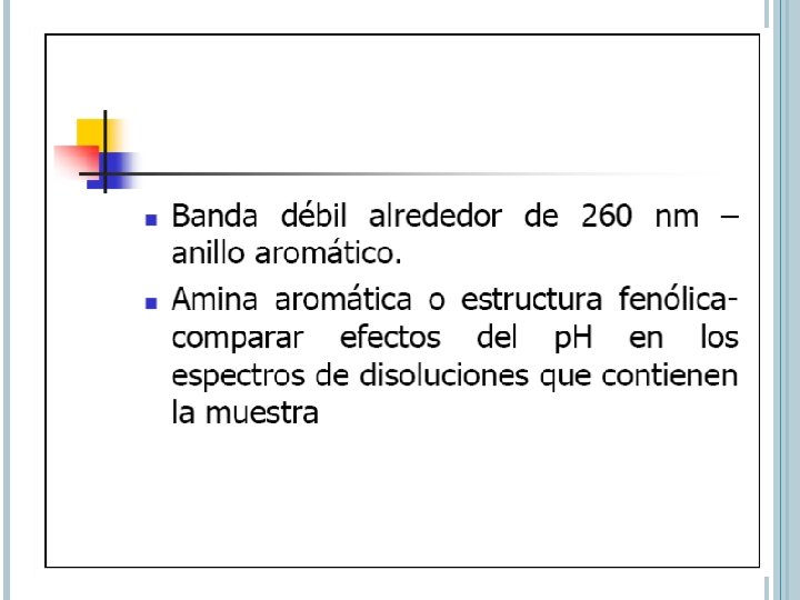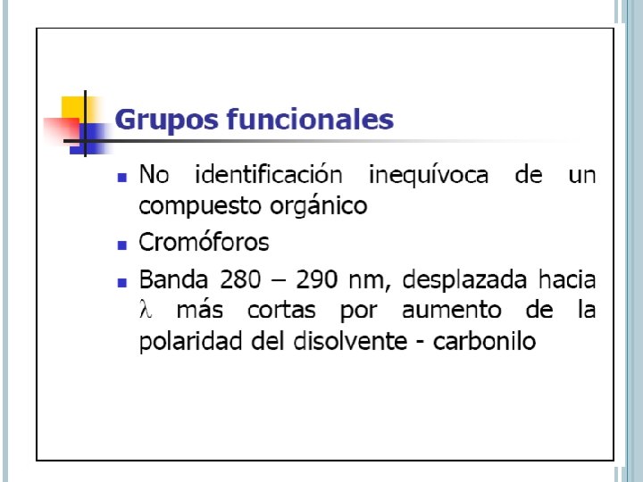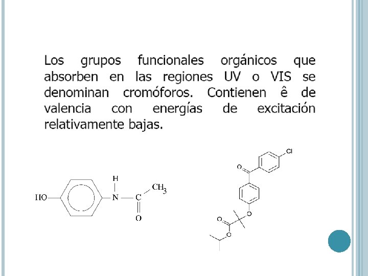 AUXOCROMO Grupo funcional que no absorbe por si los en la región UV Tiene el efecto de desplazar a los picos de los cromóforos hacia l largas. Aumenta sus intensidades Par de e- n son capaces de interaccionar con e- p del anillo Disminuye la energía de p* por efecto estabilizante