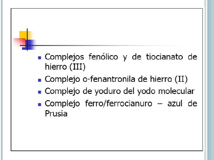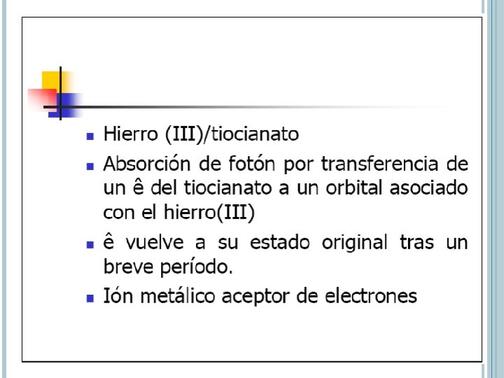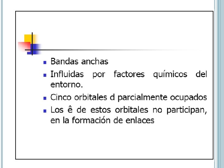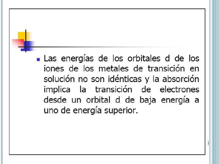 ABSORCIÓN POR ESPECIES INORGÁNICAS Iones y complejos de elementos de las 2 primeras series de transición Absorben bandas anchas de radiación visible al menos en uno de sus estados de oxidación Son coloreados electrones 3 d y 4 d