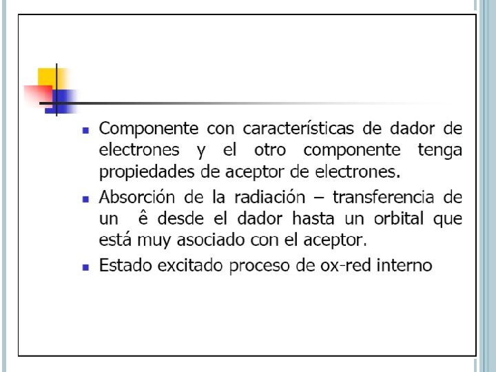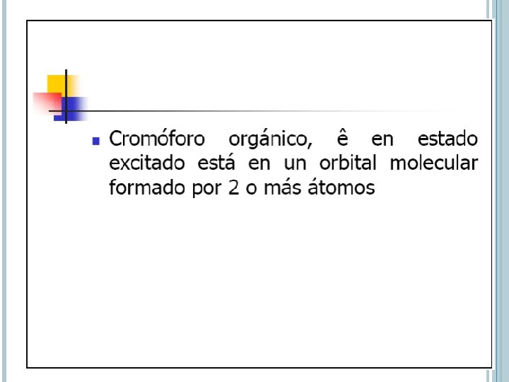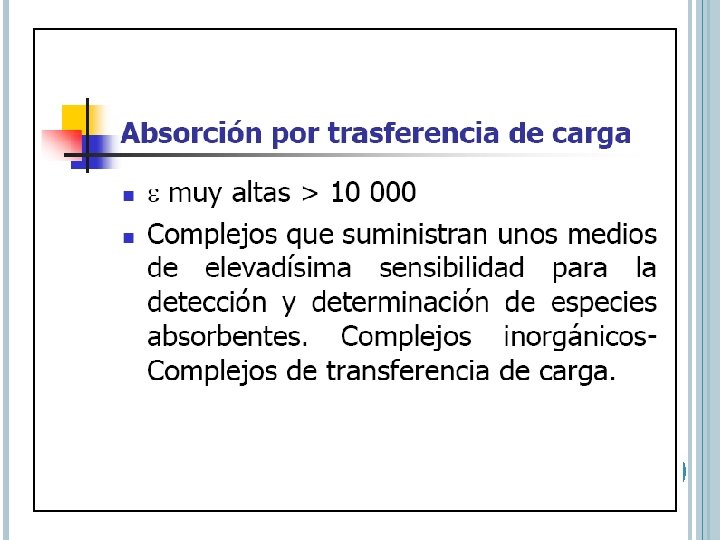 TRANSICIONES N P*, P P* l 200 – 700 nm Estrictament e – centros insaturadoscromóforos e Suministro de orbitales bajas (10 p – 100 Lcm-1 mol-1)