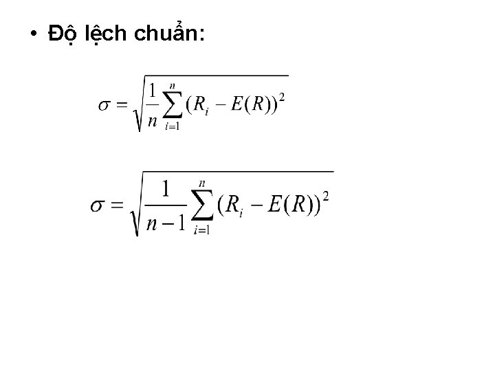 • Độ lệch chuẩn: E(R) =tỷ suất lợi suất kỳ vọng n = số tình huống có thể xảy ra lợi suất Ri=Lợi suất xảy ra đối với từng tình huống pi= xác suất xảy ra từng tình huống.