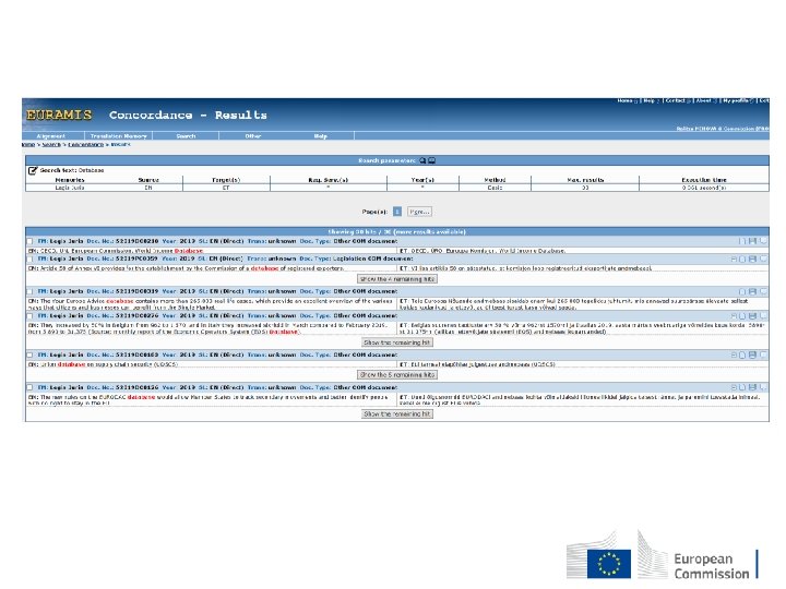 Euramis • Interinstitutional linguistic data management tool, database of parallel human-translated sentences (segments) • Started in 1995, now stores more than 1. 2 billion human-translated segments from nine EU institutions in all 24 EU languages and several others. • Average of 5000 daily operations and nearly 900 000 interactive queries in 2018. • Euramis NG project underway to improve use of metadata –more targeted searching and filtering. • Basis for e. Translation. • Parts of Euramis available for free download