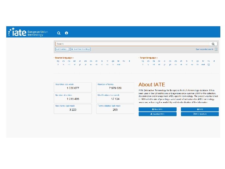 IATE • • • Interinstitutional terminology management tool Covers all 24 EU official languages About 7. 8 million terms Accessible from all over the world In 2018, close to 30 million queries from over 190 different countries